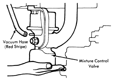 - With engine coolant temperature below 68°F (20°C), start engine and allow it to idle. Disconnect Red stripe vacuum hose from mixture control valve.