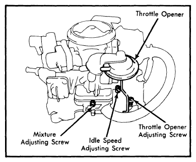 - Activate throttle opener (air conditioning "ON") and adjust throttle opener speed to specified RPM shown in table by turning throttle opener adjusting screw. See Fig 1.