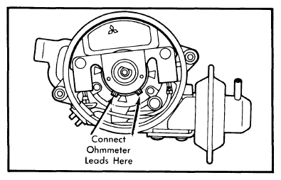 Connect an ohmmeter to terminals shown in Fig 1. With ignition switch off, resistance should read 920-1120 ohms. If not, replace pick-up coil assembly.