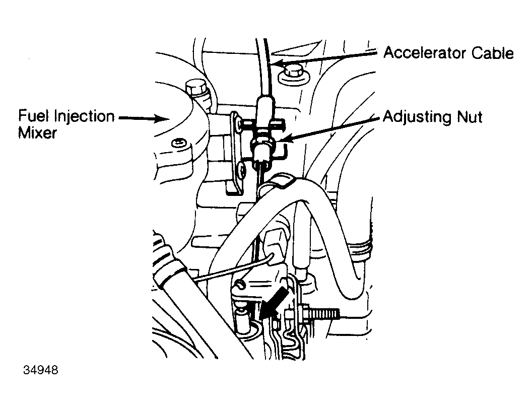 2. To adjust free play, loosen cable adjusting nut at fuel injection mixer. Adjust length of cable until free play is within specifications and tighten adjusting nut. See Fig 1 .