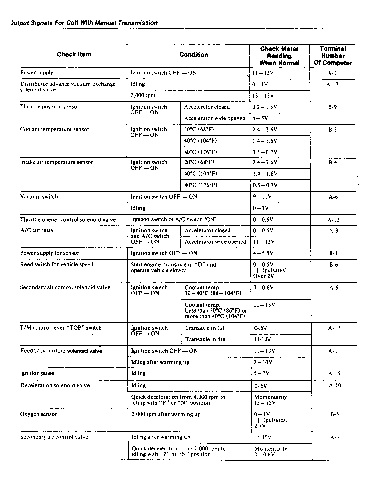 Separate computer terminal connector and identify pin terminal numeration. See Fig 1 through Fig 3 . Use a voltmeter to measure voltage at connector terminal as outlined in the OUTPUT SIGNAL CHARTS. Be sure to verify that the vehicle conditions called for in the charts are observed. Use the charts to interpret the voltage signals to isolate malfunctioning components. Note and record the results.
