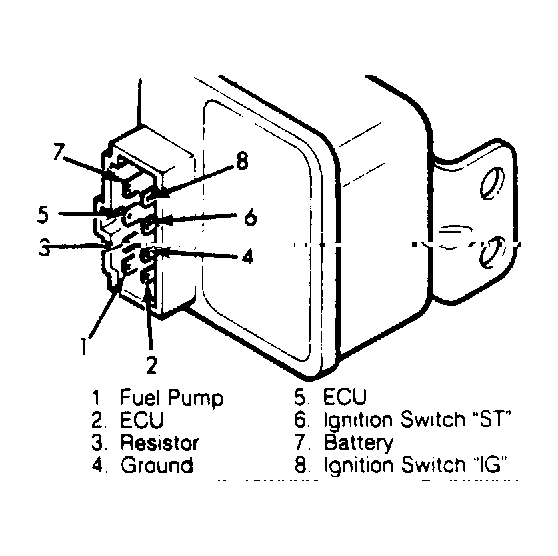 - Apply battery voltage across terminals No. 8 (positive) and No. 4 (negative) while checking continuity between terminals No. 3 and 7. If continuity is present, relay is okay. If not, replace relay.