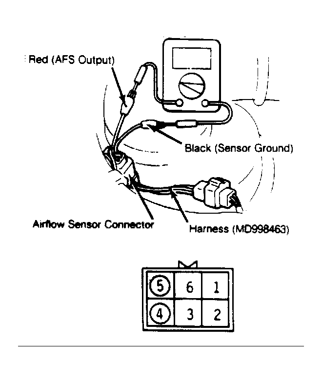 Disconnect airflow sensor connector. Check intake air temperature sensor by measuring resistance between terminals No. 2 and 4. See Fig 1 . Replace airflow sensor assembly if not to specification.