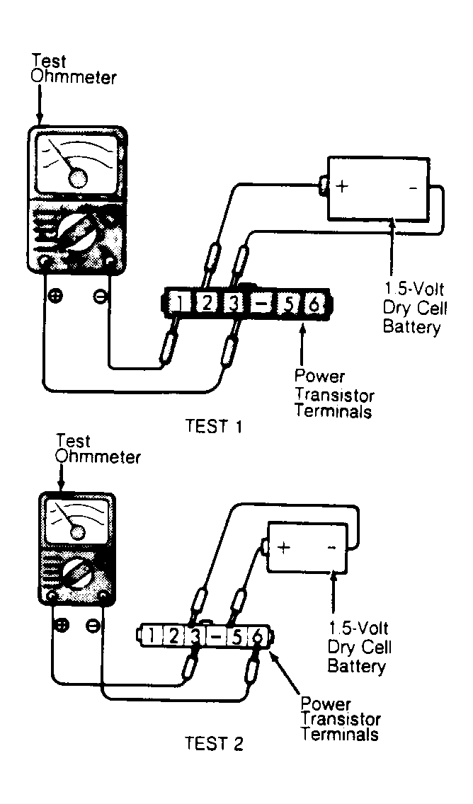 - Connect ohmmeter between power transistor terminals No. 6 and 3. Using a 1.5-volt dry cell battery, connect positive battery lead to power transistor terminal No. 5 and negative lead to terminal No. 3. Perform TEST 2. See Fig 1