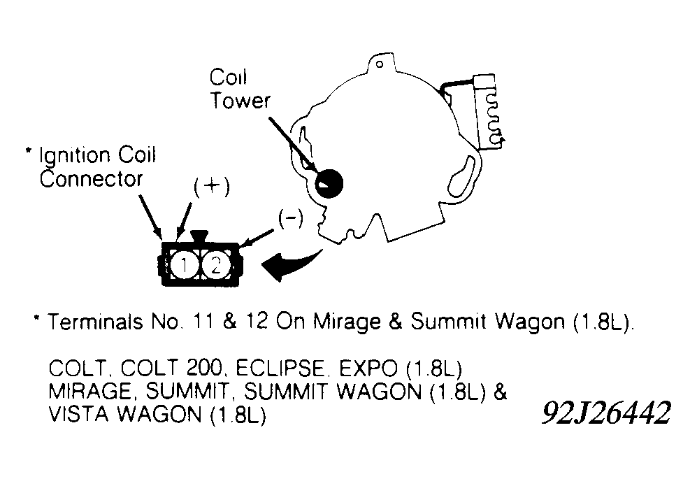 Using a DVOM, measure primary coil resistance between positive and negative terminals of coil. See Fig 1 . Measure secondary coil resistance between coil positive terminal and ignition coil tower. Primary and secondary coil resistance should be within specification. See IGNITION COIL RESISTANCE (1.5L) table.
