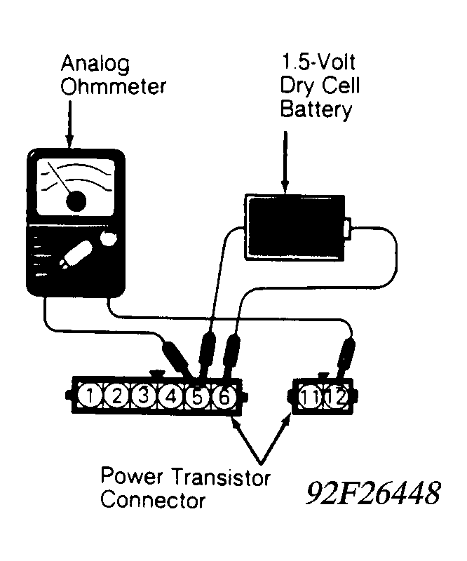 - Disconnect power transistor connector. Using a 1.5-volt dry cell battery, connect negative end of 1.5-volt battery to terminal No. 5 of power transistor and positive end of 1.5-volt battery to power transistor terminal No. 6. See Fig 1