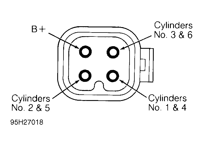 - Ensure 12.66 volts or more (battery voltage) is available to operate cranking and ignition systems. Disconnect wiring connector from coil pack. Connect a test light between B+ terminal at coil harness connector (Dark Green/Black wire) and ground. See Fig 1 .