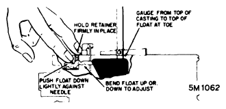 Measure from top of float bowl gasket surface with gasket removed to top of float at toe end with gauging point 1/16" back from toe radius. Make certain retaining pin is held firmly in place and tang of float is seated in float needle. Distance from float tow to gasket surface of bowl should be as specified (see Specifications ). Adjust by bending float up or down as necessary (see Fig 1).
