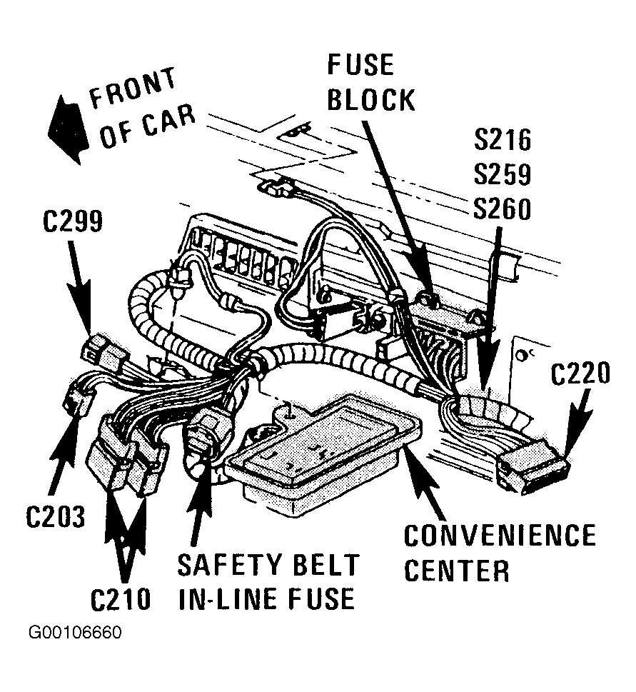 | S216 | In Instrument Panel Harness, Behind Right Side Of Instrument Panel, Left Of Fuse Block. See Fig 1 |