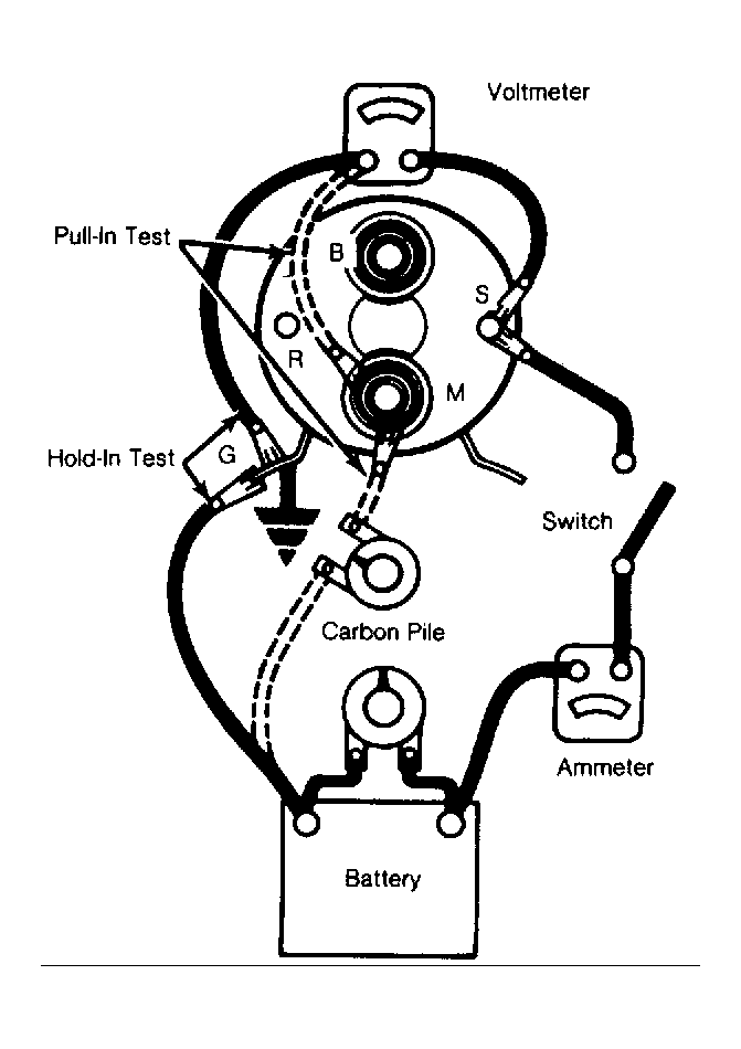- Disconnect motor field coil at solenoid "M" terminal and insulate the field connector. See Figure. Connect a 12-volt positive lead to solenoid "S" terminal and other lead to ground. Touch a jumper lead from solenoid "M" terminal to starter frame, shifting pinion into cranking position.