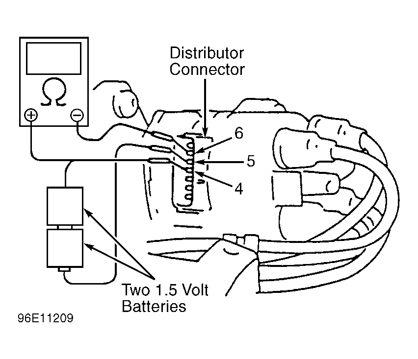 1. Disconnect distributor harness connector. Connect two 1.5 volt batteries together in series (3 volts). Using an ohmmeter, connect positive lead to terminal No. 4 of distributor and negative lead to terminal No. 6. See Fig 1 .