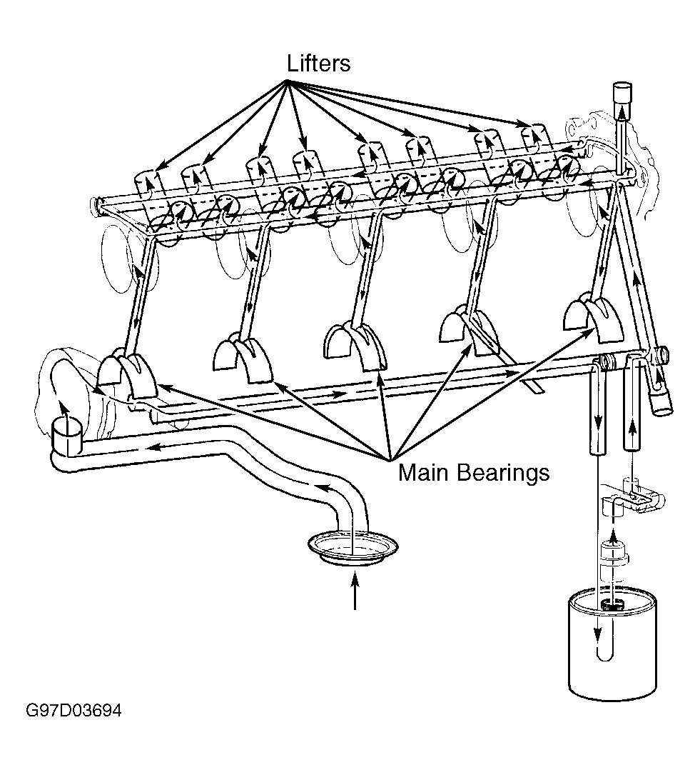 A gerotor-type oil pump provides pressurized lubrication through full-flow oil filter. Oil pump is bolted to front of cylinder block, behind front cover, and is driven directly by crankshaft. See Fig 1 .