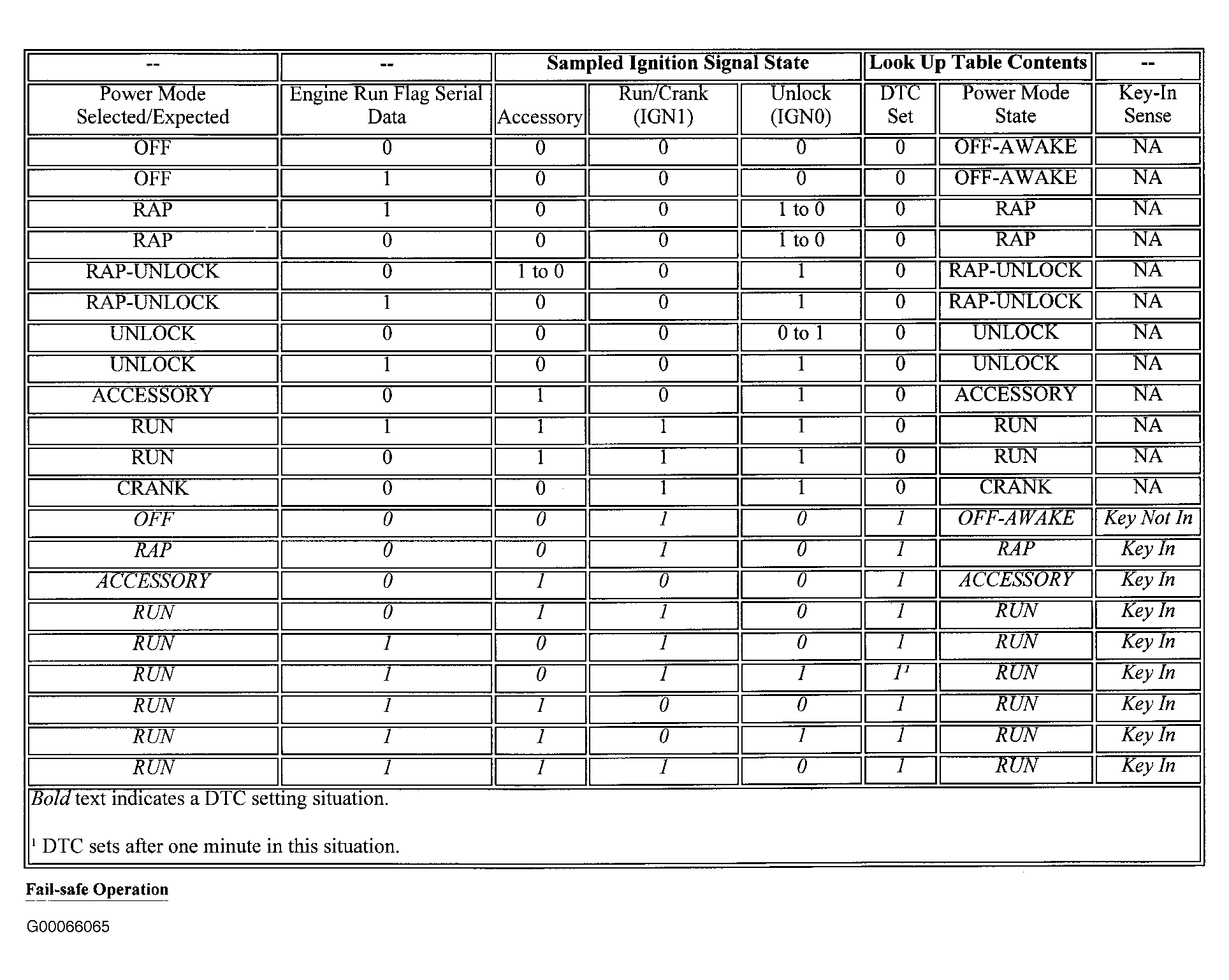 On vehicles that have several control modules connected by serial data circuits, one module is Power Mode Master (PMM). On Aztek, PMM is Body Control Module (BCM). The PMM receives 3 signals/circuits from ignition switch. These are Unlock (IGN0), Run/Crank (IGN1) and Accessory (ACC) ignition switch signals/circuits. To determine correct power mode PMM uses: The state of these signals/circuits, either switch closed (B+ = 1) or switch open (open = 0). The sequence of switch closures received by the PMM. The status of engine run flag. Chart below indicates the mode detected and transmitted by PMM. See Fig 1.