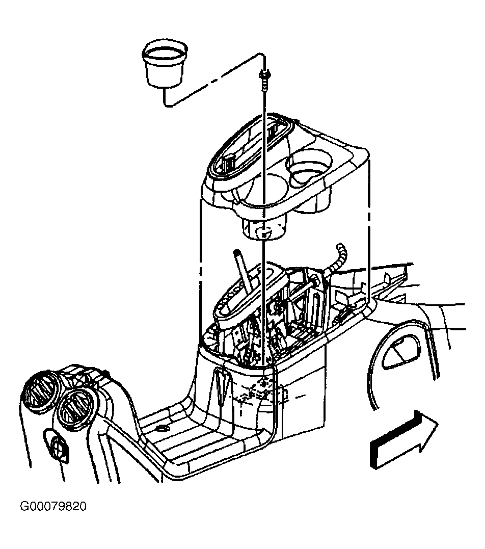 Align the trim plate to the front floor console. Position the trim plate over the gearshift lever. Install the trim plate to the front floor console and snap into place. See Fig 1. Install the rear trim plate screw and insert the cup holder liner. Tighten the screw to 18 INCH lbs. (2 N.m).