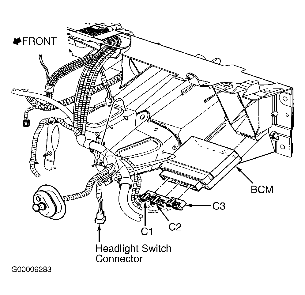10. Disconnect fused jumper wire. Turn ignition switch to OFF position. Disconnect BCM Pink, 24-pin connector C1. See Figure. Check for short or open in Light Green wire between splice pack SP205 harness connector terminal "M" and BCM Pink, 24-pin harness connector C1 terminal A5. See Fig 3. See appropriate wiring diagram in DATA LINK CONNECTORS article in WIRING DIAGRAMS. Repair as necessary and go to step  29. If wire is okay, go to step  27.