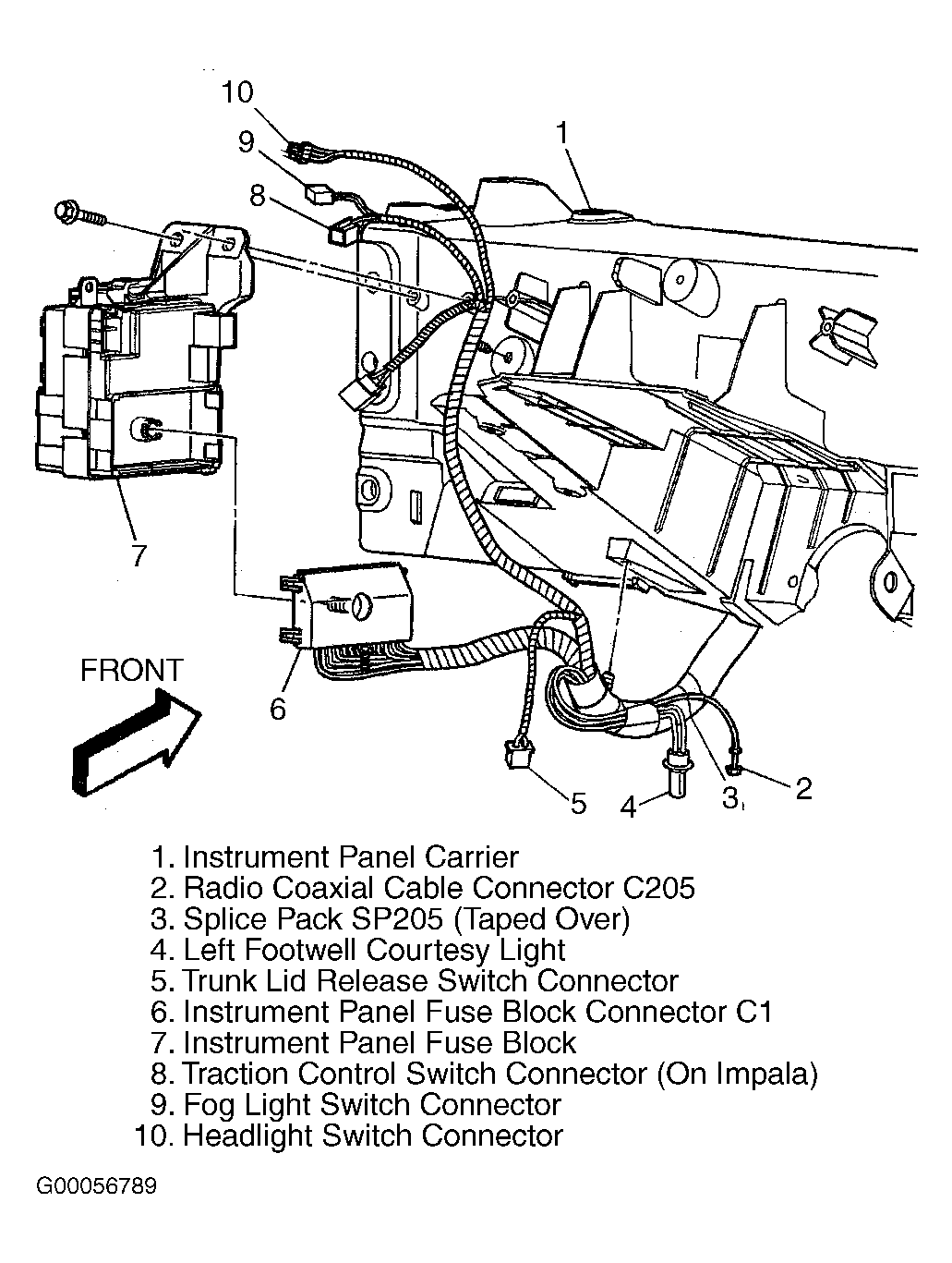 7. Disconnect splice pack SP205. See Figure. Check for poor terminal contact at splice pack SP205 connector. Repair as necessary and preform appropriate diagnostic system check for suspect system. See DIAGNOSTIC SYSTEM CHECK  table. If connection is okay, go to next step.