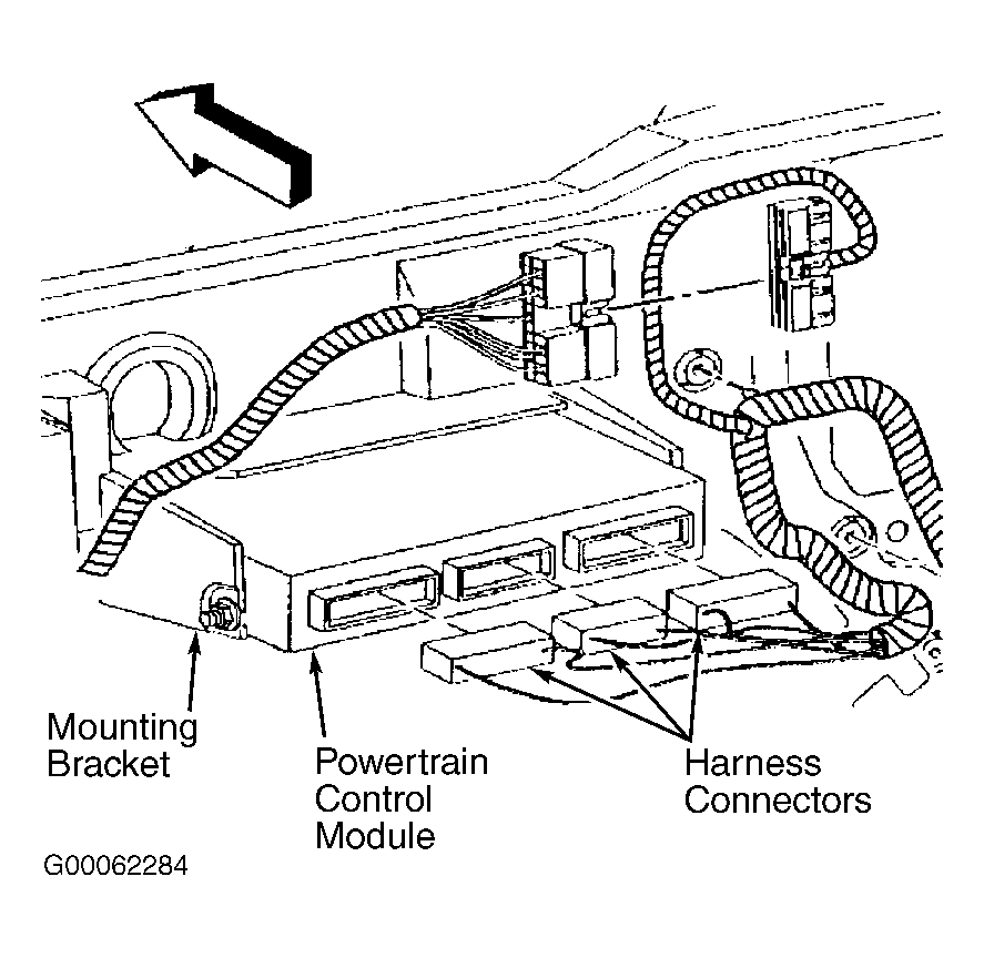 Disconnect the negative battery cables. Remove engine cover. Disconnect harness connectors from powertrain control module (PCM). See Fig 1 . Remove PCM mounting nuts. Remove PCM from mounting bracket. Remove the PCM mounting hardware. To install, reverse removal procedure. Program as necessary. See PROGRAMMING  . The MIL, anti-lock and brake lights will continue to be enabled until PCM is programmed. Once programming is complete, lights will be turned OFF and normal operation will occur.