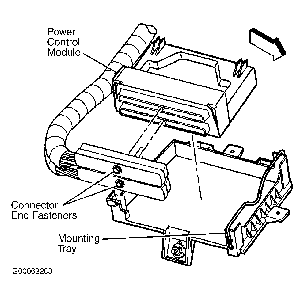 Ensure ignition switch is in OFF position. Remove air cleaner assembly. Disconnect PCM harness connectors. Release spring latch from PCM. Lift PCM from mounting tray. See Fig 1 . Remove PCM from engine compartment. To install, reverse removal procedure. Tighten PCM connector end fasteners to 71 INCH lbs. (8 N.m). Program as necessary. See PROGRAMMING  .