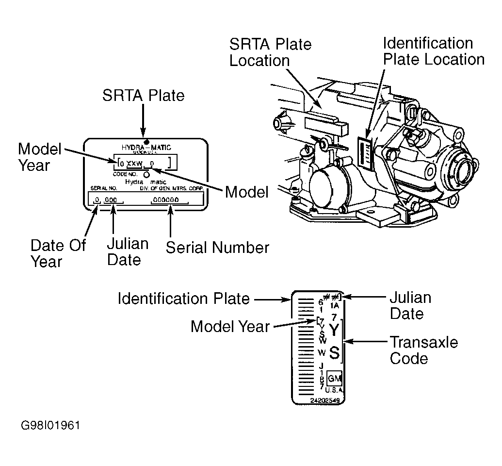 Transaxle has a metal identification plate or Service Replacement Transaxle Assembly (SRTA) plate attached to rear face of transaxle. See Fig 1 .