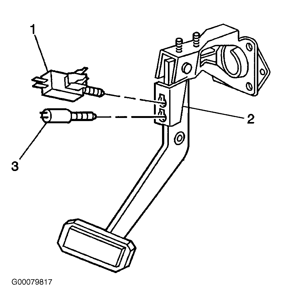 Insert the stoplamp switch (1) and the cruise control switch if equipped into the brake pedal bracket (2). See Fig 1. Install the stoplamp switch and the cruise control switch (3) if equipped into the slotted grooves until the switches are fully depressed against the brake pedal, then turn the switches clockwise approximately 1/4 turn. The switches should now be installed and adjusted. See Fig 2. Inspect the stoplamps and the cruise control for proper operation.