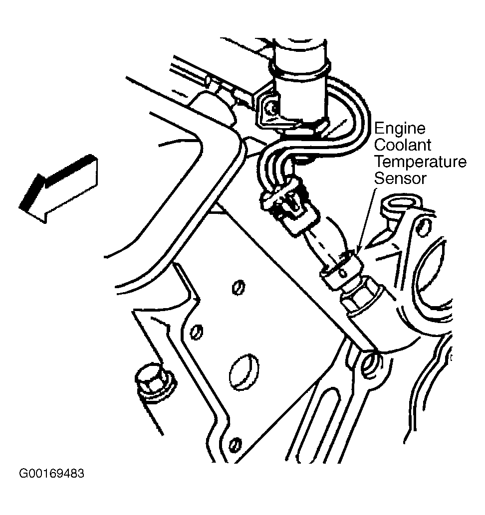 The Engine Coolant Temperature (ECT) sensor is a thermistor (temperature sensitive resistor) located in an engine coolant passage, near thermostat housing. See Fig 1 . The PCM supplies and monitors a 5-volt signal to ECT sensor. This monitored 5-volt signal is then modified by resistance of the ECT sensor. When coolant temperatures are low, ECT sensor resistance is high and the PCM sees a high monitored voltage signal. When coolant temperatures are high, ECT sensor resistance is low and the PCM sees a low monitored voltage. When fully warmed, ECT sensor should reflect a temperature of at least 185°F (85°C).