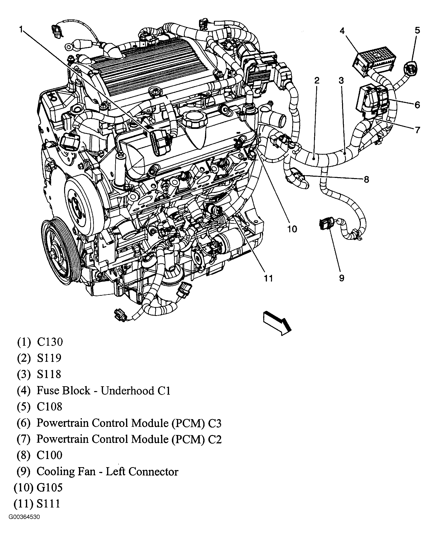 | S119 | In engine harness, between left cooling fan connector breakout & throttle actuator control (TAC) module breakout, approximately 15 cm (6 in) from left cooling fan connector breakout. See Figure. |