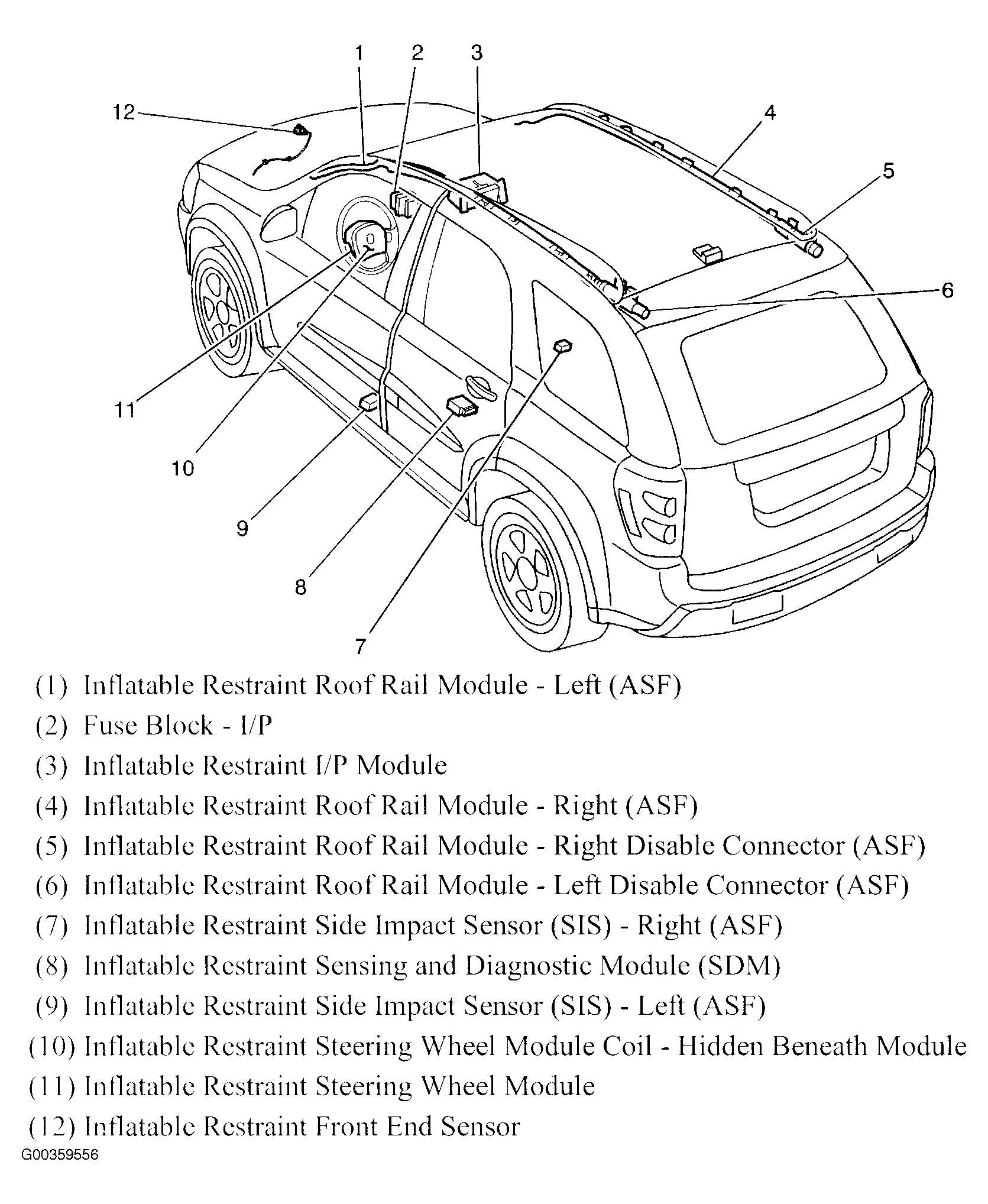 | Inflatable Restraint Roof Rail Module - Right | Behind headliner, above front passenger. See Figure. |