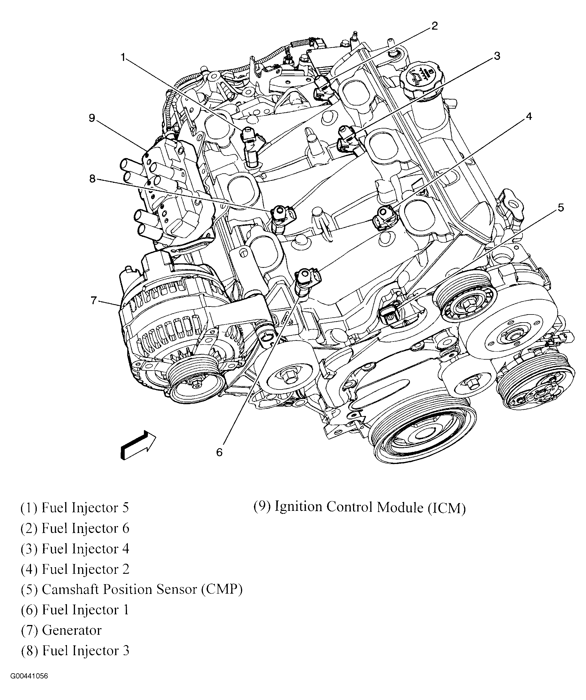 Ignition Control Module (ICM) At top right rear of engine. See Figure.