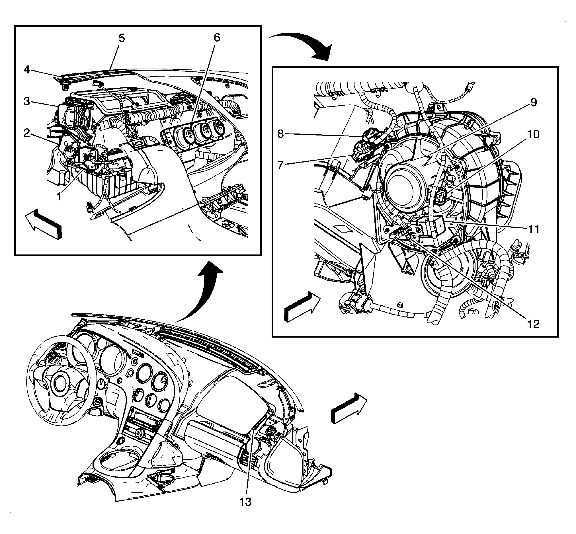 | Inflatable Restraint I/P Module | Under passenger side of dash. See Figure. |