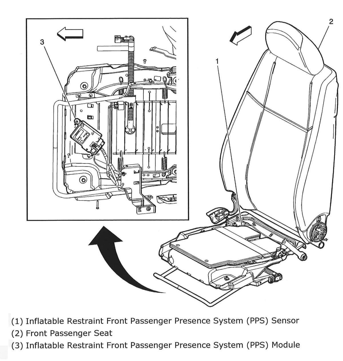 | Inflatable Restraint Front Passenger Presence System Module | Under passenger seat cushion. See Figure. |