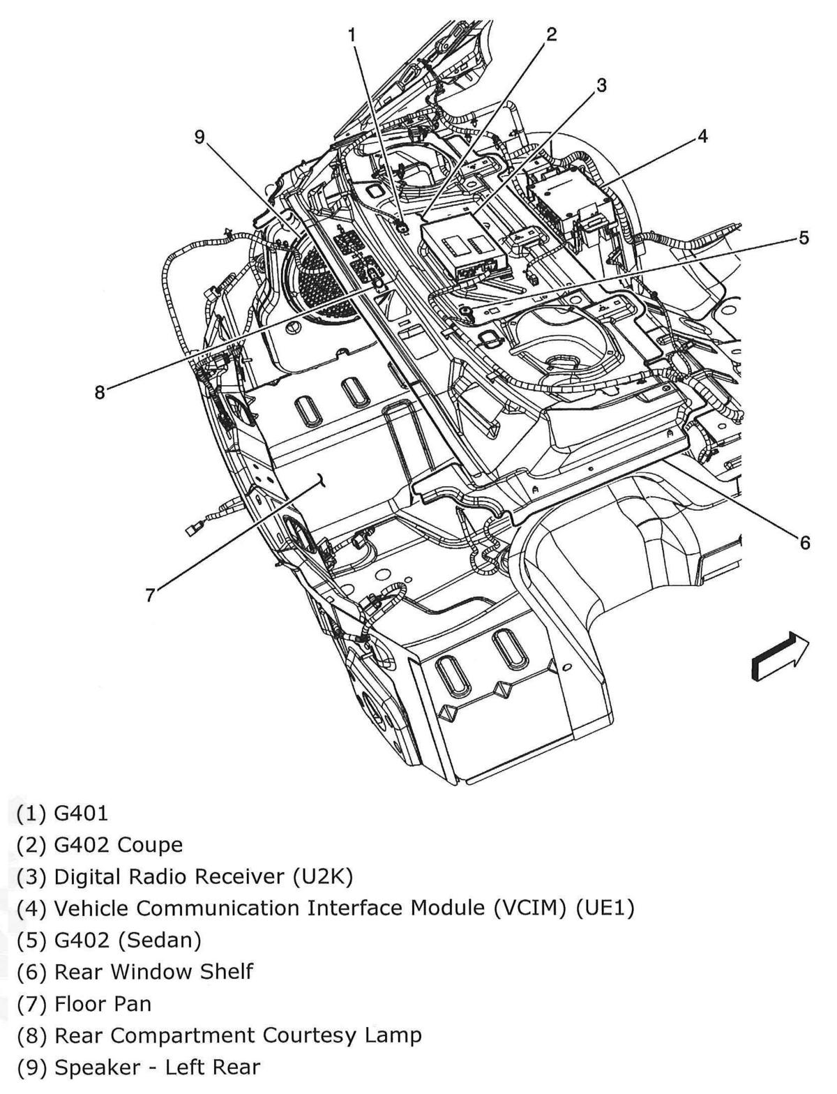 | Vehicle Communication Interface Module (VCIM) | Under rear, shelf between speakers. See Figure. |