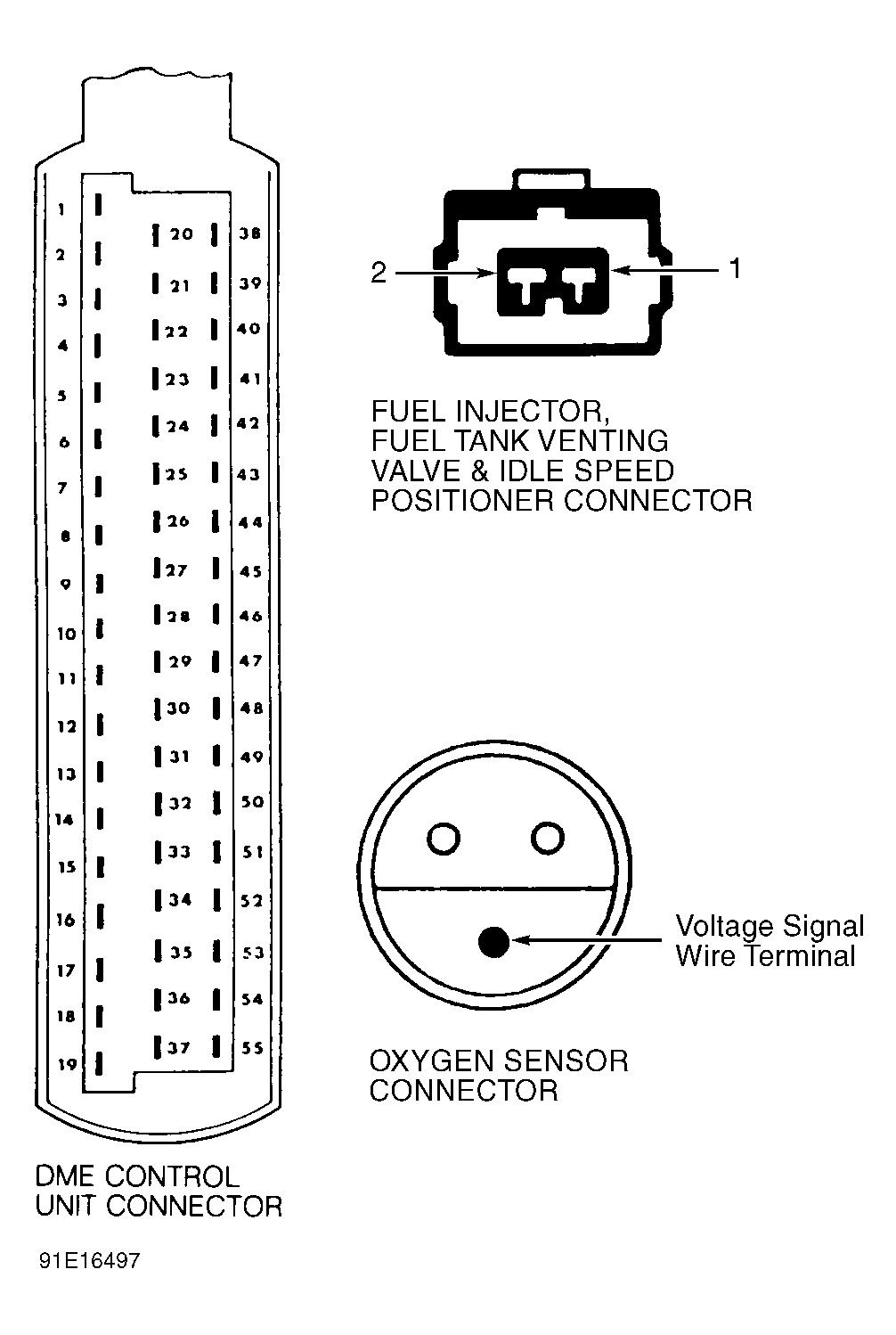 - Use DVOM to check continuity to ground on Digital Motor Electronics (DME) control unit ground circuits at terminals No. 14, 19, 24 and 30. See Figure . See WIRING DIAGRAMS article in the ENGINE PERFORMANCE Section. Ensure ohmmeter reading is zero ohm.