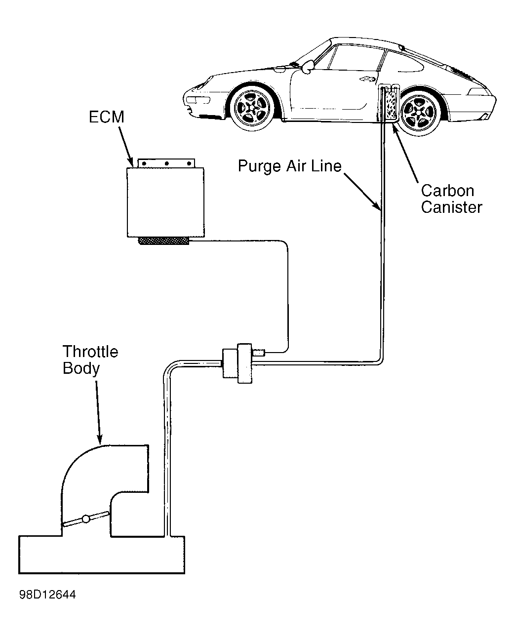 Check fuel vapor lines for damage or restriction. See Fig 1. Check connector at ECM and solenoid valve for corrosion or loose fit. Check hose fitting at throttle body tight fit. Repair or replace as necessary.