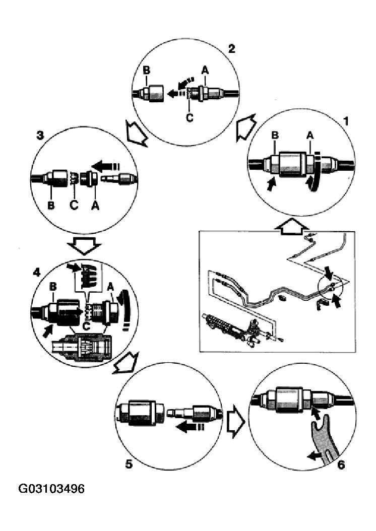 Pipelines that were fitted once before are joined by screwing together (as opposed to new lines and steering lines, which are plugged together). This is necessary because holder C is located very deep in the threaded part of the plug-in coupling and cannot be removed with conventional workshop equipment.