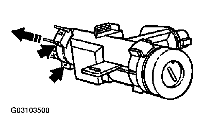 5. Remove screw locking paint in the threaded bores of the two fastening screws (short arrows). Slightly loosen both fastening screws (short arrows) using special tool 9631 and pull the ignition switch out of the housing (direction arrow). See Fig 2 .