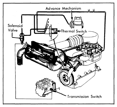 On California models, a Blue and White delay valve, slowly releases vacuum inside vacuum advance unit. Vacuum between distributor and thermal switch goes to atmosphere through a calibrated orifice. See Fig 1.