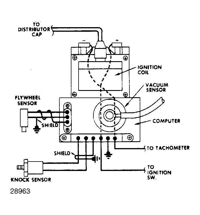 The vacuum sensor, which cannot be removed from the computer housing, supplies the computer with engine load conditions. The computer also receives information from a spark knock (detonation) sensor.