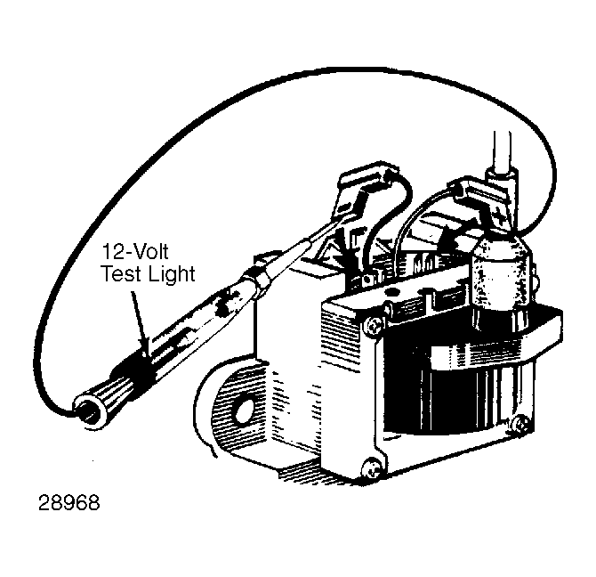 - Be sure all connectors are attached to computer. Disconnect harness connectors from coil primary terminals. Install 12-volt test lamp between 2 connectors just removed. See Fig 1.
