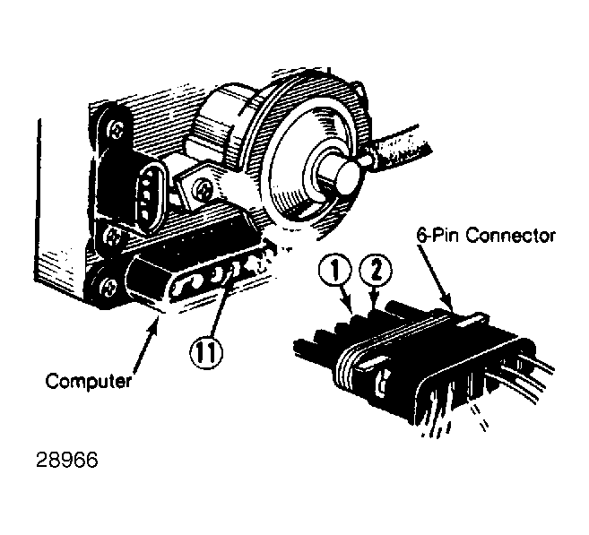 - Disconnect 6-pin connector from computer. Turn ignition "OFF". Connect ohmmeter leads to pin 2 of harness connector and to vehicle ground. See Figure.
