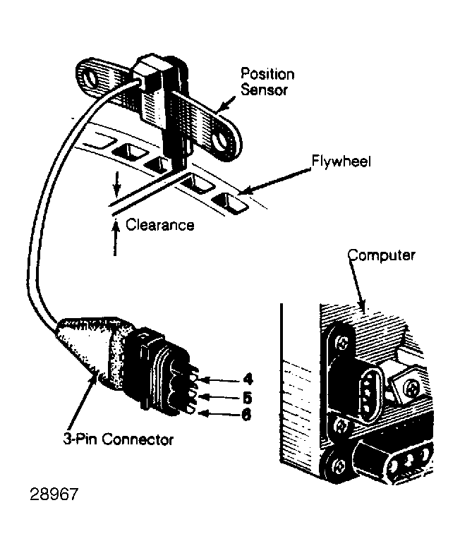 - Disconnect 3-pin connector from computer. See Fig 1. Turn ignition switch "OFF". Attach ohmmeter leads to terminals 4 and 5 of 3-pin harness connector.