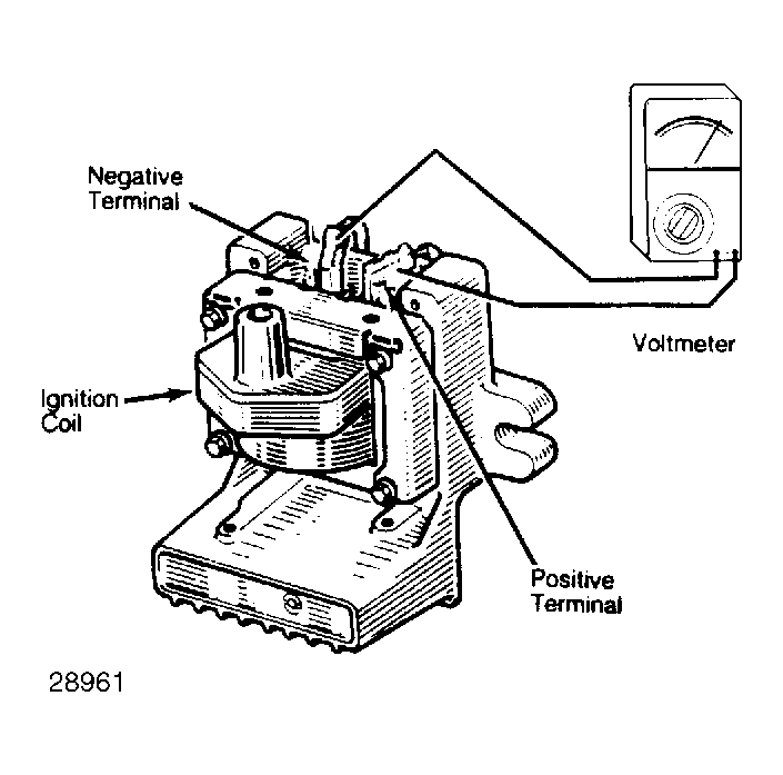- Turn the ignition switch to the "ON" position. Connect positive voltmeter lead to ignition coil positive terminal. Connect remaining lead to ignition coil negative terminal. See Fig 1.