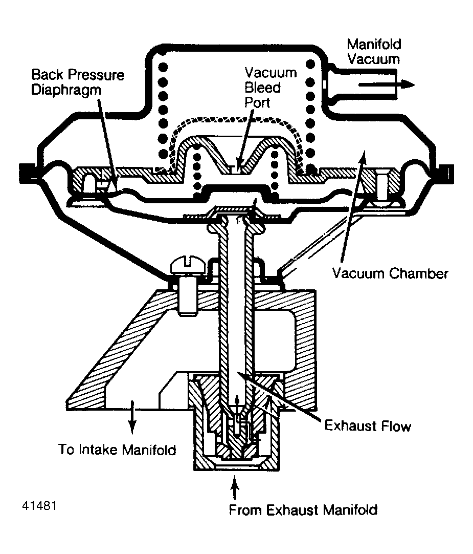 The back-pressure controlled EGR valve operates only when exhaust pressure is high enough to close a vacuum bleed port. Manifold vacuum then pulls the valve open, allowing exhaust gases to enter the intake manifold. When exhaust back pressure drops, the bleed port is opened, intake vacuum bleeds off, and the valve closes. See Fig 1 .