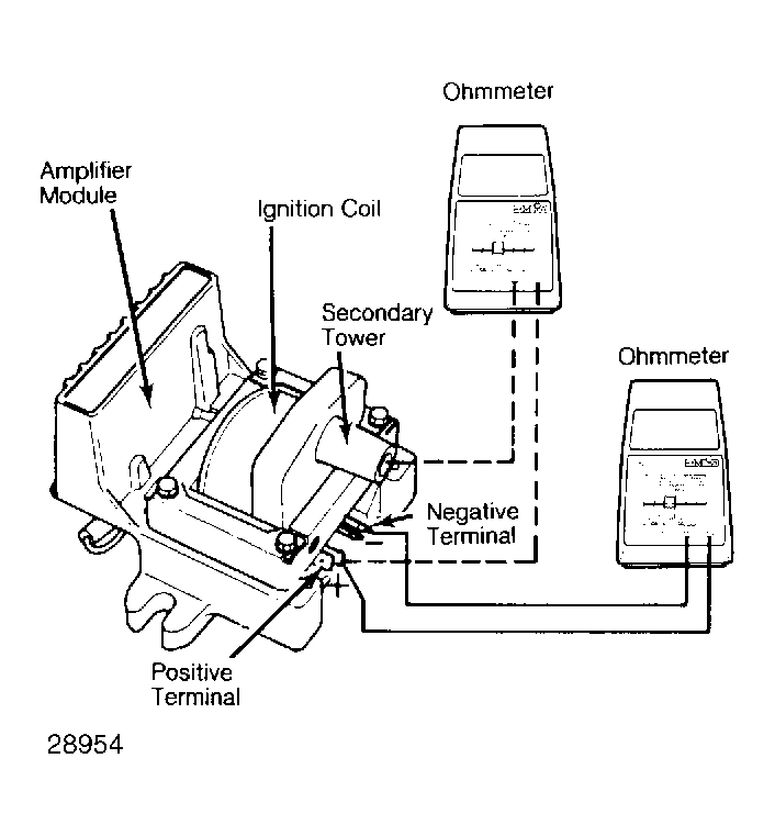 - Connect ohmmeter set in the x1000 scale to the coil positive terminal and its secondary tower. Reading should be 9,000-11,000 ohms. If either reading is not to specifications, replace ignition coil.