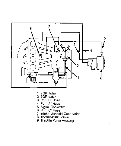 - Operate engine to normal operating temperature. Disconnect port "A" hose from signal converter at throttle valve housing. See Figure . Disconnect and plug port "C" hose from signal converter at intake manifold.
