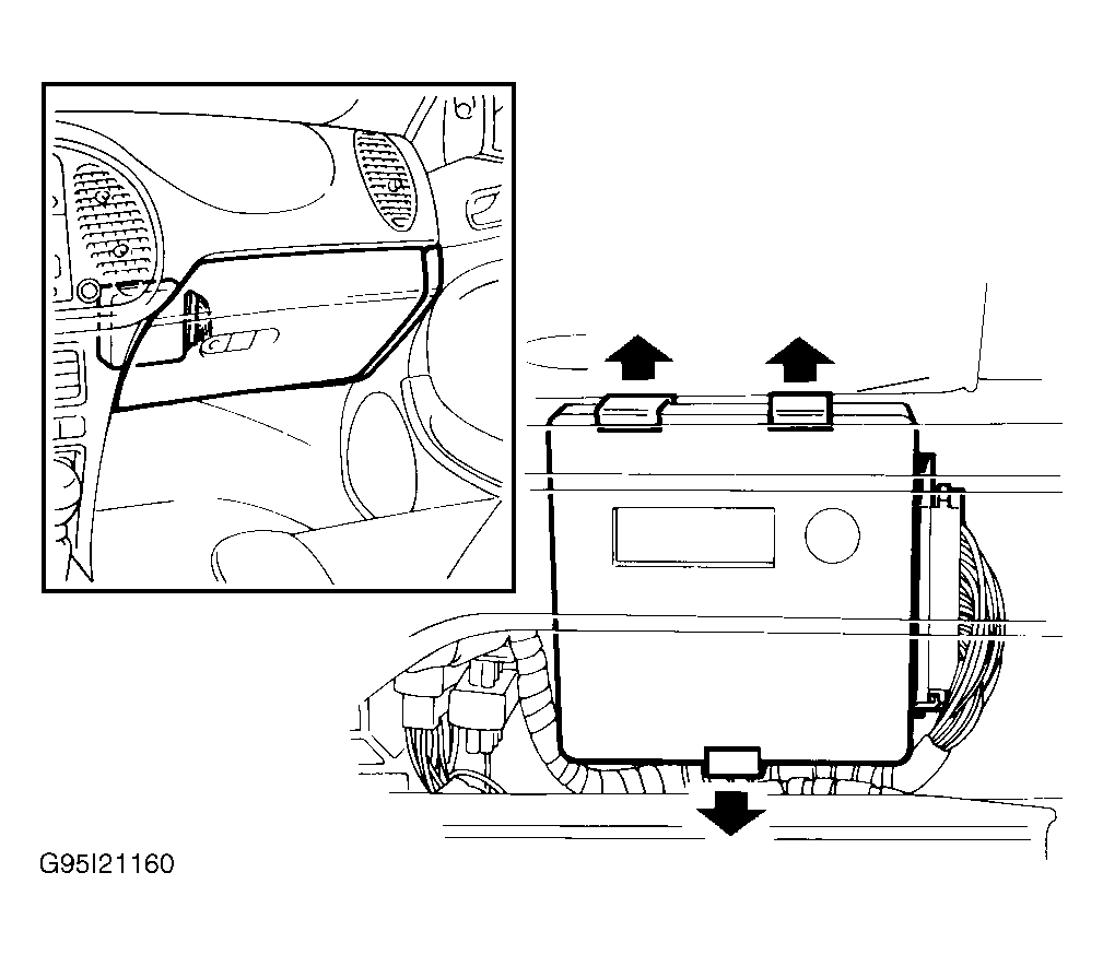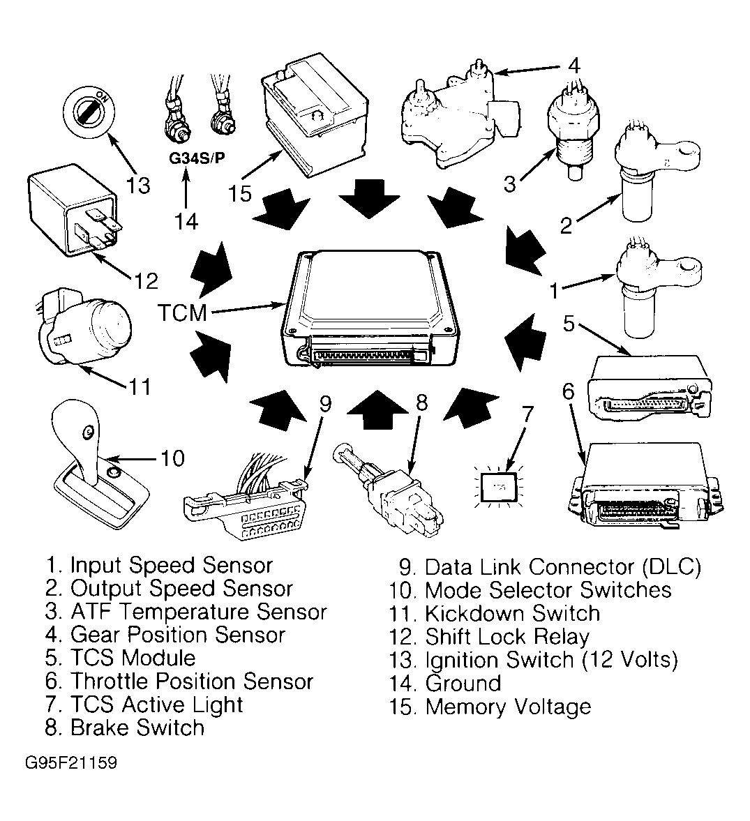 Transaxle Control Module (TCM) is located behind glove box. See Fig 1 . TCM determines shift points and torque converter lock-up timing based on input signals received from various components. Components include mode selector switches, Throttle Position Sensor (TPS), input speed (RPM) sensor, output speed sensor, gear position sensor, TCS module, Automatic Transaxle Fluid (ATF) temperature sensor, brake switch and kickdown switch. See Figure .