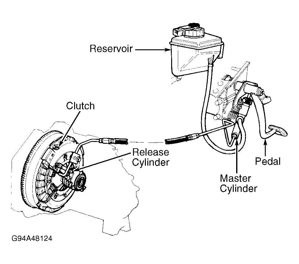 Clutch consists of a clutch disc, pressure plate and throw-out bearing. Throw-out bearing is mounted to a release cylinder located inside clutch housing, and is operated hydraulically by a clutch master cylinder. See Fig 1 .