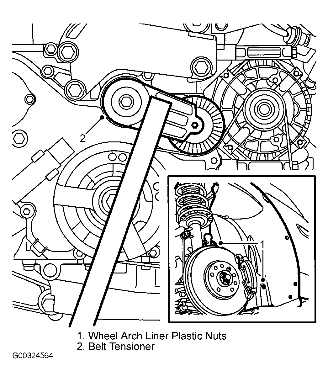 - Remove the plastic nuts from the wheel arch liner. Move aside the wheel arch liner, unload the belt tensioner and take off the belt (mark the belt direction). Use appropriate belt circuit unloading tool. See Fig 1 .