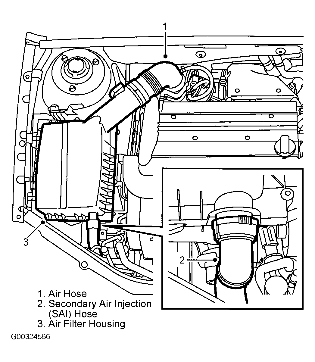 - Detach the air hose from the air filter housing. Detach the Secondary Air Injection (SAI) hose. Remove the cover of the air filter housing. See Fig 3 . Remove the air filter.