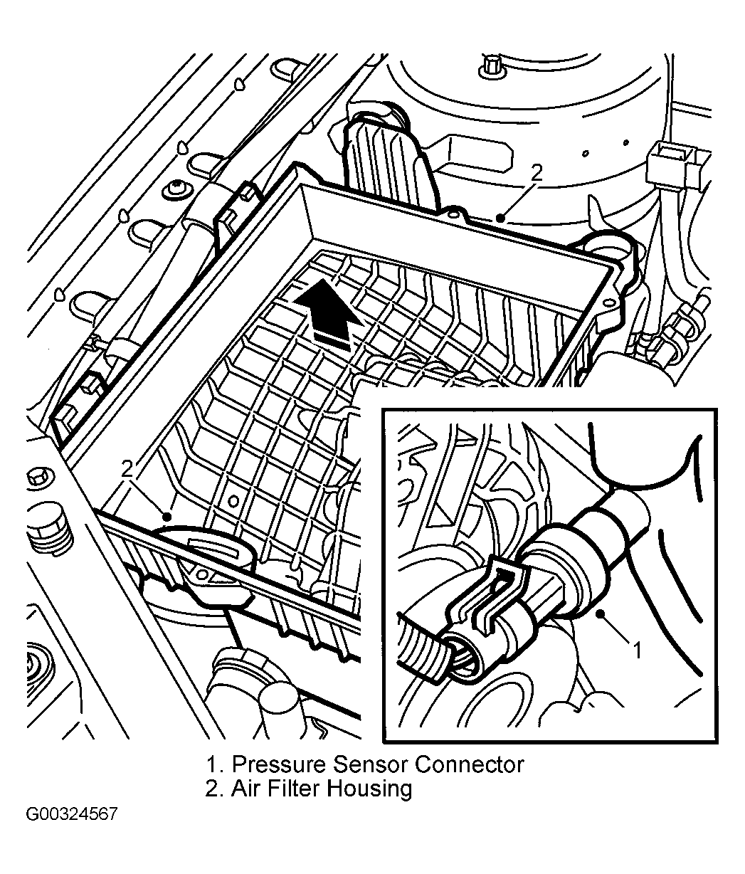 - Unplug the connector from the pressure sensor. Detach the intake air pipe from the air filter housing and lift up the filter housing. See Fig 4 .