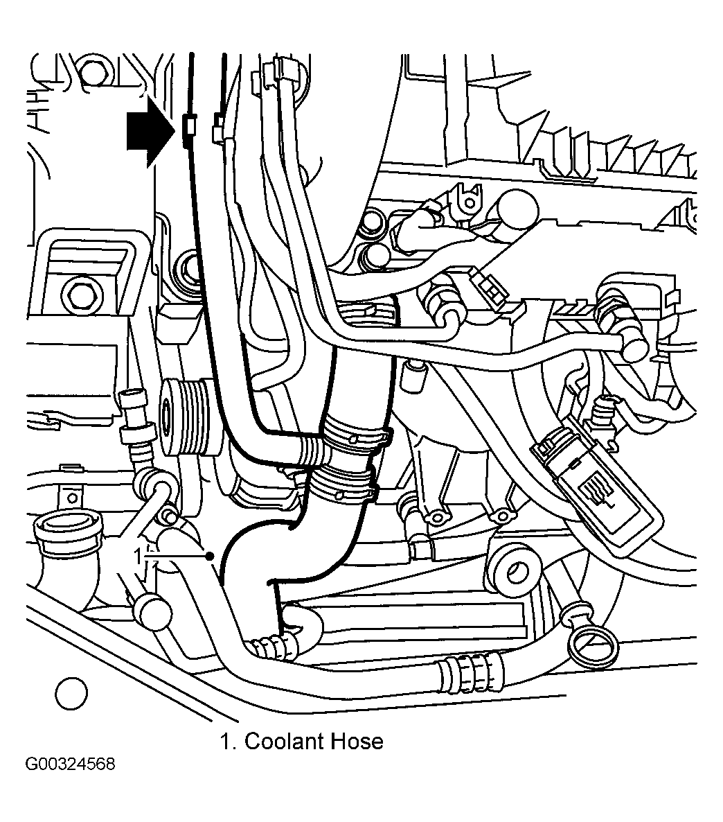- Detach the coolant hose from the engine and radiator. Bend it aside. See Fig 5 .